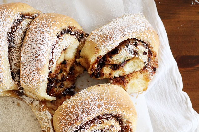 Σε μια ελαφρά αλευρωμένη επιφάνεια τοποθετούμε τη ζύμη και πλάθουμε για 10 λεπτά προσθέτοντας περισσότερο αλεύρι αν χρειαστεί και στη συνέχεια λαδώνουμε ένα μπολ τοποθετούμε τη ζύμη μέσα και καλύπτουμε με μια πλαστική μεμβράνη. Αφήνουμε να φουσκώσει για 2 ώρες. Στη συνέχεια απλώνουμε σε μια αλευρωμένη επιφάνεια και ανοίγουμε τη ζύμη περίπου 11×15 και απλώνουμε το μαλακό βούτυρο ομοιόμορφα πάνω στη ζύμη προσθέτοντας στη συνέχεια τη μαύρη ζάχαρη, τη κανέλα, τη σκόνη κακάο και τα τσιπ σοκολάτας. Κάνουμε ρολό τη ζύμη και στη συνέχεια την ενώνουμε τοποθετώντας τη σε ένα ταψί όπου έχουμε προσθέσει λαδόκολλα. Κόβουμε προσεχτικά τη ζύμη σε κομμάτια χωρίς να τη κόψουμε μέχρι κάτω και στη συνέχεια καλύπτουμε με μια πετσέτα για 45 λεπτά. Προθερμαίνουμε παράλληλα τον φούρνο στους 200 βαθμούς και ψήνουμε για 20 λεπτά μέχρι να ροδίσουν. Προσθέτουμε ζάχαρη άχνη και σερβίρουμε.