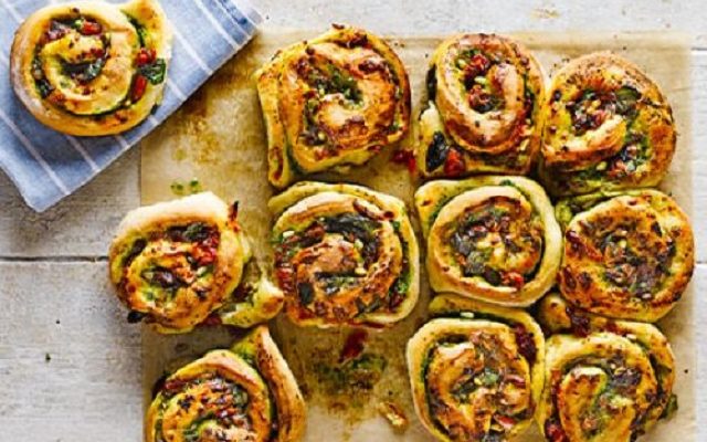 Ανακατεύουμε το αλεύρι, τη μαγιά, τη ζάχαρη και 1 ½ κγ αλάτι σε ένα μεγάλο μπολ. Προσθέτουμε στη συνέχεια 300ml ζεστό νερό και προσθέτουμε στο αλεύρι μαζί με ελαιόλαδο ανακατεύοντας καλά. Ζυμώνουμε για 10 λεπτά σε μια αλευρωμένη επιφάνεια. Σε ένα λαδωμένο μπολ τοποθετούμε τη ζύμη και σκεπάζουμε με μια μεμβράνη αφήνοντας σε ένα ζεστό μέρος για 3 ώρες περίπου. Ανοίγουμε τη ζύμη σε ορθογώνιο και απλώνουμε το πέστο, τις τομάτες και τα τυριά μαζί με το βασιλικό. Στη συνέχεια τυλίγουμε. Χρησιμοποιώντας ένα μαχαίρι κόβουμε τη ζύμη σε 12 κομμάτια και κάνουμε στριφτάρια. Λαδώνουμε καλά ένα ταψί και τοποθετούμε τα στριφτάρια μέσα. Αφήνουμε για μια ώρα μέχρι να διπλασιαστεί πάλι και προθερμαίνουμε τον φούρνο στους 200 βαθμούς. Ψήνουμε για 40 λεπτά και στη συνέχεια… απολαμβάνουμε!