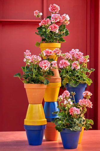 Ένας πύργος από πολύχρωμα βαμμένα κεραμικά γλαστράκια ενωμένα μεταξύ τους αποτελεί μια πρωτότυπη ιδέα και έναν διασκεδαστικό τρόπο για να αναδείξετε τα πλούσια και ανθισμένα γεράνια σας. Συμβουλή: Τοποθετήστε διάφορους πύργους διαφορετικού ύψους τον έναν δίπλα στον άλλο. Έτσι δημιουργείται ένας καταρράκτης από άνθη, που μπορεί να χρησιμοποιηθεί για να κρύψει μια αντιαισθητική επιφάνεια τοίχου.