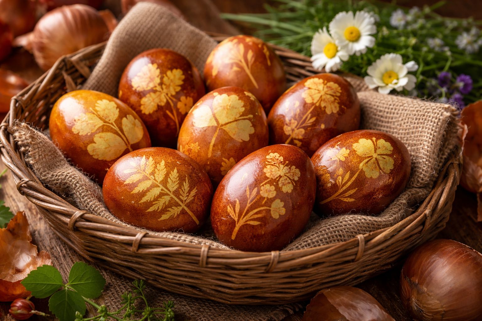 Οι φλούδες αυτές, όταν βράσουν μαζί με τα αυγά, δημιουργούν ένα ζεστό καφέ ή κοκκινωπό χρώμα, ενώ αν τοποθετήσεις πάνω στο αυγό μικρά φύλλα ή λουλούδια, αφήνουν πάνω του φυσικά σχέδια. Η μέθοδος αυτή είναι παλιά και χρησιμοποιείται σε πολλές χώρες της Ευρώπης για φυσική βαφή αυγών. Το αποτέλεσμα είναι αυγά με γήινα χρώματα και μοναδικά μοτίβα. Κανένα δεν μοιάζει με το άλλο.